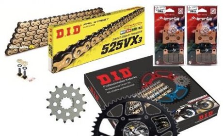 Vsebuje: sprednji zobnik + zadnji zobnik + veriga + zavorne ploščice sintrana sprednje komplet za dva diska.
